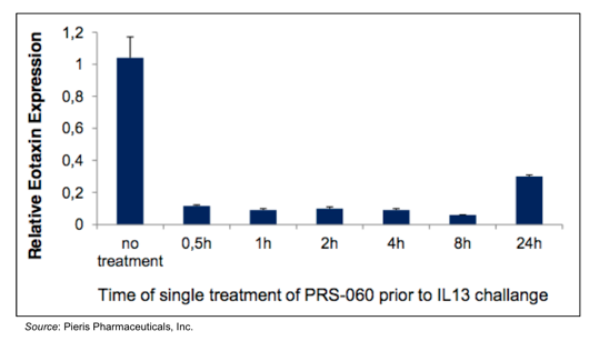Efficacy of inhaled PRS-060 is shown in the following graphic, in which eotaxin expression (a marker of airway inflammation) was induced by administration of IL-13 to the lungs of mice after pre-treatment with inhaled PRS-060. The data shows that eotaxin expression is inhibited for up to 24 hours following a single inhaled dose of PRS-060.
