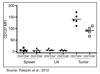 Another important aspect of CD137 is that it is preferentially expressed in high levels on intratumoral T-cells (Palazón et al., 2012). This is shown in the following graph, where CD4+ and CD8+ T-cells were extracted from the spleen, lymph nodes, and tumor of mice bearing CT26 tumors. Only T-cells purified from tumors showed expression of CD137, whereas T-cells from other locations from the same mice did not show increased expression of CD137.