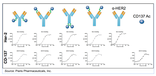 Pieris has done a number of studies on different CD137-specific Anticalin’s® to identify the lead molecule to advance into clinical testing. The company revealed that this lead compound has a very high affinity for CD137 (~2 nM), activates T-cells in an ex vivo model, and binds to CD137 in a “non-competitive fashion”. What this means is that binding of the Anticalin® to CD137 does not interfere with the binding of CD137 and its natural ligand. The flexibility of the Anticalin® platform is exemplified in the following graphic, which shows that no matter how the Anticalin® is attached to the monoclonal antibody, both entities retain the ability to bind to their respective ligands with essentially the same affinity.
