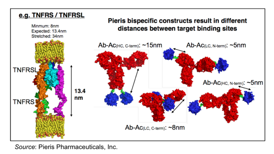 Another advantage of the flexibility of the Anticalin® platform is that the bispecific geometry of the molecule can be manipulated to create different pharmacodynamic effects. This is shown in the following graphic, where multiple distances between HER2 and CD137 binding can be tested to determine the optimal target synapse. Preclinical work such as this is ongoing, with selection of the drug candidate to advance into clinical testing most likely being completed by the end of 2015.