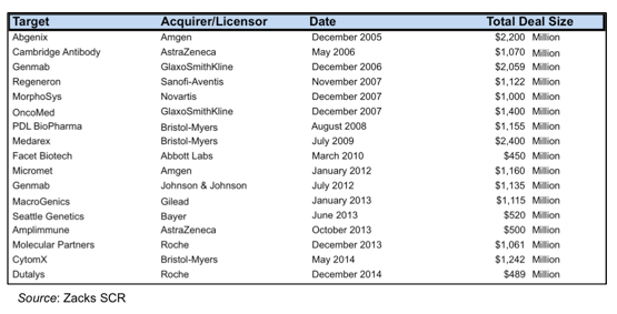 The wide range of diseases being targeted by Pieris is indicative of the flexibility and adaptability of the Anticalin® platform, and could make Pieris highly sought after by larger biopharmaceutical companies over the next few years, both as a partner or an acquisition candidate. A number of companies with novel protein-binding platforms (most of which have been various monoclonal antibody technologies) have either been acquired or signed lucrative partnership deals over the past few years, as shown in the following table.