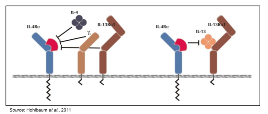 PRS-060 is an Anticalin® that has very high affinity for IL4Ra (Kd ~ 20 pM) and does not bind to the related cytokine receptors IL6R, IL18R, and IL23R. By targeting IL4Ra, PRS-060 inhibits binding of both IL-4 and IL-13, as depicted in the following graphic.