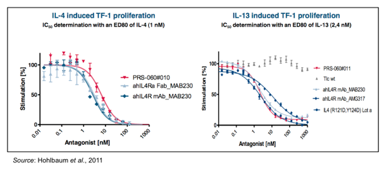 The inhibition of IL-4 and IL-13 binding by PRS-060 was shown in a series of preclinical experiments involving erythroleukemic (TF-1) cells that proliferate upon stimulation with a wide range of cytokines. The cells were preincubated for 30 min with PRS-060 or other IL4Ra antagonists prior to stimulation with IL-4 (left) or IL-13 (right). Cell proliferation was measured five days after treatment and graphed as a function of increasing amounts of IL4Ra antagonist. The results show that PRS-060 is able to inhibit both IL-4 and IL-13 dependent proliferation.