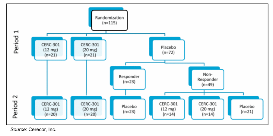 The Phase 2 trial was a randomized, double blind, placebo controlled study evaluating the antidepressant effect of 12 mg and 20 mg doses of CERC-301 in MDD patients currently experiencing a severe depressive episode despite stable ongoing treatment with either an SSRI or SNRI (NCT02459236). A total of 115 patients were randomized into the trial, which was conducted over two sequential one-week periods. In Period 1, 21 patients each were randomized to receive a 12 mg or 20 mg dose of CERC-301 while 72 patients were administered placebo. Assessments were taken on Days 2 and 4 following dosing. In Period 2, those who received CERC-301 received another dose, while those who received placebo in Period 1 were divided into responders (n=23) and non-responders (n=49). The placebo responders again received another dose of placebo. The non-responders were then randomized to receive either a 12 mg or 20 mg dose of CERC-301 or placebo. Assessments were taken on Days 2 and 4 following administration of the second dose of treatment. This is depicted in the following graphic.