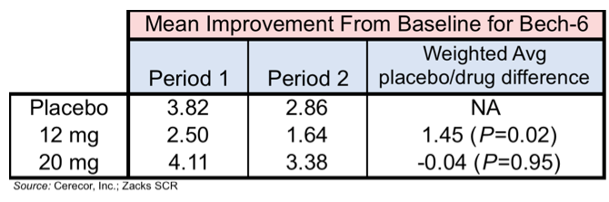 The following chart shows the results in the mean Bech-6 Averaged over Days 2 and 4 for Period 1 and 2 along with the weighted average for the difference between placebo and drug. The placebo dose was statistically significantly better than the 12 mg dose, while there was no statistical difference between the 20 mg dose and placebo.
