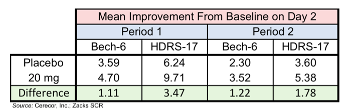 On November 29, 2016, Cerecor, Inc. (NASDAQ:CERC) announced topline results for the Phase 2 study of CERC-301 in major depressive disorder (MDD). The results showed that the trial failed to show efficacy on the primary endpoint for mean improvement in the Bech-6 scale, which is a subset of the Hamilton Depression Scale (HDRS-17), averaged over Days 2 and 4 post dose. While the result of the trial was disappointing, the company did report a potentially clinically meaningful effect on the Bech-6 and HDRS-17 for the 20 mg dose group on Day 2.