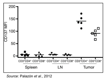 Palazón et al., 2012). This is shown in the following graph, where CD4+ and CD8+ T-cells were extracted from the spleen, lymph nodes, and tumor of mice bearing CT26 tumors. Only T-cells isolated from tumors showed expression of 4-1BB, whereas T-cells from other locations from the same mice did not show increased expression of 4-1BB.