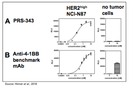 Another important aspect of PRS-343 is that it is less likely to induce serious systemic side effects than other 4-1BB-specific therapies due to activation of 4-1BB only occurring in the tumor microenvironment. The following figure shows the results of a luciferase reporter assay performed with Jurkat reporter cells that overexpress 4-1BB, in which activation of the 4-1BB signaling pathway leads to an increase in luminescence. The following graphs show that PRS-343 activates the 4-1BB signaling pathway, but only in the presence of HER2-overexpressing NCI-N87 cells. In contrast, an anti-4-1BB antibody leads to activation of the 4-1BB signaling pathway regardless of whether tumor cells are present or not. These data support the idea that PRS-343 will not activate 4-1BB outside of the tumor microenvironment, as no “clustering” is likely to occur away from HER2-overexpressing cells.