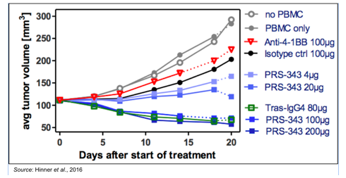 To test PRS-343 in vivo, immuno-compromised mice were engrafted with SK-OV-3 cells, which are a human ovarian cancer cell line that overexpresses HER2. When the tumors reached a volume of approximately 120 mm3, the mice were injected with human peripheral blood mononuclear cells (PBMC), which include lymphocytes (T cells, B cells, NK cells) and monocytes, along with the first dose of treatment. Treatments were given on Day 0, 7, and 14 and consisted of a 4-1BB specific monoclonal antibody, an IgG4 isotype control antibody, PRS-343 at 4 different doses, or a modified version of trastuzumab (anti-HER2 antibody) with an IgG4 backbone (to match the backbone on PRS-343).