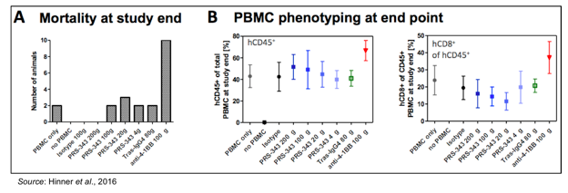 Any treatment that augments the activity of T-cells runs the risk of immune-mediated disease. However, the mechanism of action for PRS-343 is less likely to lead to systemic activation of the immune system in the periphery due to the two co-stimulatory signals required for T-cell activation. This is evident in the following figures, which show a greatly increased toxicity in mice treated with an anti-4-1BB antibody leading to increased mortality from graft-versus-host disease. This was due to a greatly increased percentage of CD45+ cells in the periphery (not in the tumor microenvironment) that contained a large percentage of CD8+ T-cells in animals treated with anti-4-1BB antibody.