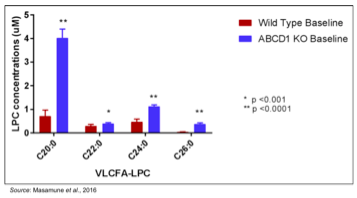 To study the potential use of VK0214 in X-ALD, Viking tested VK0214 in the ABCD1 knockout (KO) mouse model, and while this model does not recapitulate the inflammation seen with severe forms of X-ALD, these mice do develop a phenotype similar to AMN with advanced age along with an accumulation of certain very long chain fatty acids (VLCFAs) in tissues and plasma (Lu et al., 1997). The following graph shows an accumulation of different VLCFAs in the blood of ABCD1 KO mice used in this experiment compared to wild-type controls. VLCFAs are denoted as “CX:Y” with “X” corresponding to the number of carbons in the fatty acid chain and “Y” corresponding to the number of double bonds in the chain.