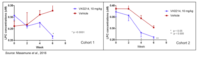 A pilot experiment was performed in 16 ABCD1 KO mice randomized 3:1 to receive VK0214 or placebo once daily for six weeks. Mice receiving VK0214 demonstrated rapid reductions in the mean level of C26:0, while control animals saw no reduction. After six weeks of treatment, mice receiving VK0214 had a 40% reduction in whole blood C26:0 levels relative to controls (