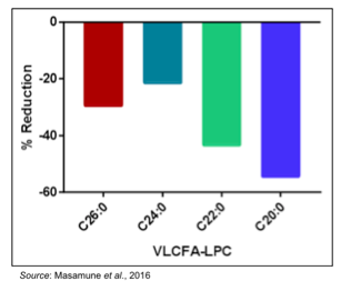 Plasma taken from Cohort 2 mice was analyzed for the presence of different VLCFAs at two, four, and six weeks. The results show mean reductions of approximately 20-60% in the levels of C26:0, C24:0, C22:0, and C20:0 in mice treated with VK0214 compared to placebo at week six, as shown in the following figure. The importance of reducing shorter chain VLCFAs is unclear, however it may suggest a potential reduction in available substrates for elongation to the more problematic C24:0 and C26:0 VLCFAs, leading to even greater long term reductions in these longer chain VLCFAs.