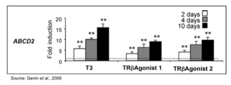 Fibrates (Albet et al., 1997), thyroid hormones T3 and T4 (Fourcade et al., 2003), and 4-phenylbutyrate (Gondcaille et al., 2005) all stimulate the expression of ABCD2 in the liver, thus proving that pharmacological induction of ABCD2 expression is feasible. Furthermore, since T3 is able to induce expression of ABCD2 (through binding of TRβ), it stands to reason that a TRβ-specific agonist would also cause the same effect. In fact, TRβ-specific agonists have been shown to increase expression of ABCD2 in a manner similar to T3 (Genin et al., 2009). The following figure shows the results of treating human HepG2 liver cells with either T3 or TRβ-specific agonists, with ABCD2 expression being significantly increased compared to control treated cells (dashed line) after 2, 4, and 10 days of treatment. Thus, we believe there is ample evidence to support the development of VK0214 as a treatment for X-ALD.