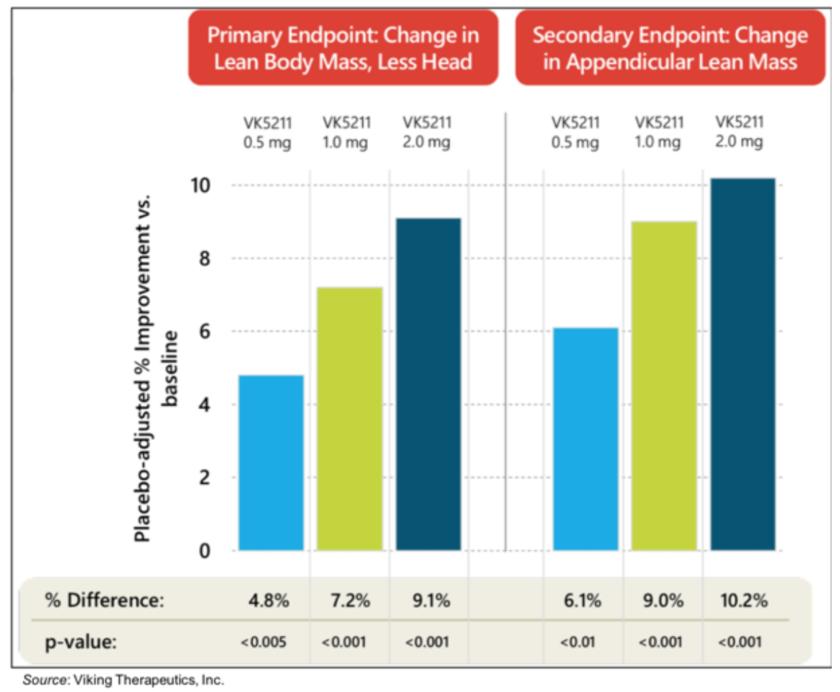 Fox et al., 2000). Also, the company’s scientific advisors had stated that a 2-4% increase in lean body mass, less head, would be considered a positive outcome, thus even the lowest dose performed better than those assumptions. Lastly, these results also appear to be superior to those seen in a Phase 2 study in healthy men >60 years of age of enobosarm, a SARM being developed by GTX Inc. (GTXI). In that study, the highest dose of enobosarm (3 mg) resulted in an ~3% increase in lean body mass, which is less than that seen for the lowest dose of VK5211 in a similar population (