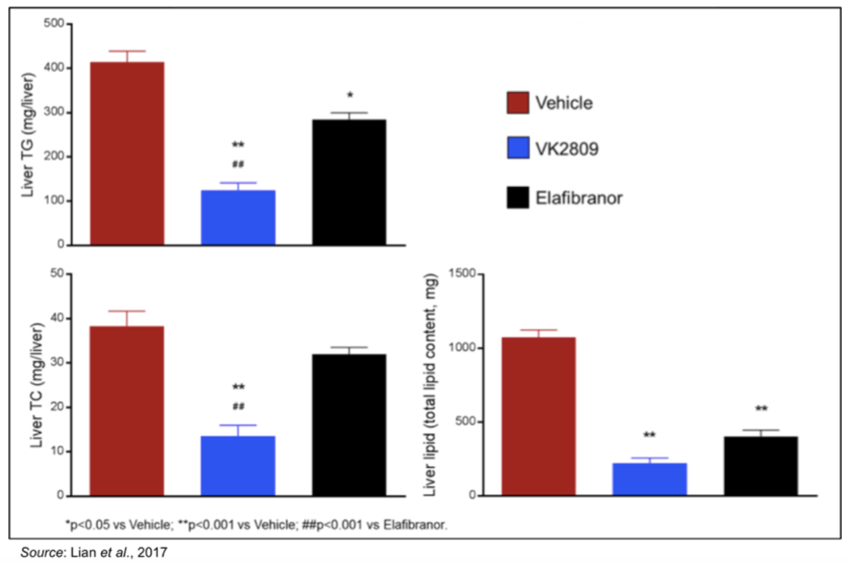 announced the presentation of results from a study of VK2809 in an in vivo model of non-alcoholic steatohepatitis (NASH). Statistically significant improvements in a number of key measures were seen during the study and gene expression analysis showed statistically significant changes in expression for genes associated with the development and progression of NASH. The following figure shows levels of liver triglycerides (-70%), liver total cholesterol (-65%) and liver total lipid content (-80%) were all significantly lower in mice treated with VK2809 compared to vehicle control mice. The difference in liver triglycerides and liver cholesterol was also significant between VK2809- and elafibranor-treated mice.