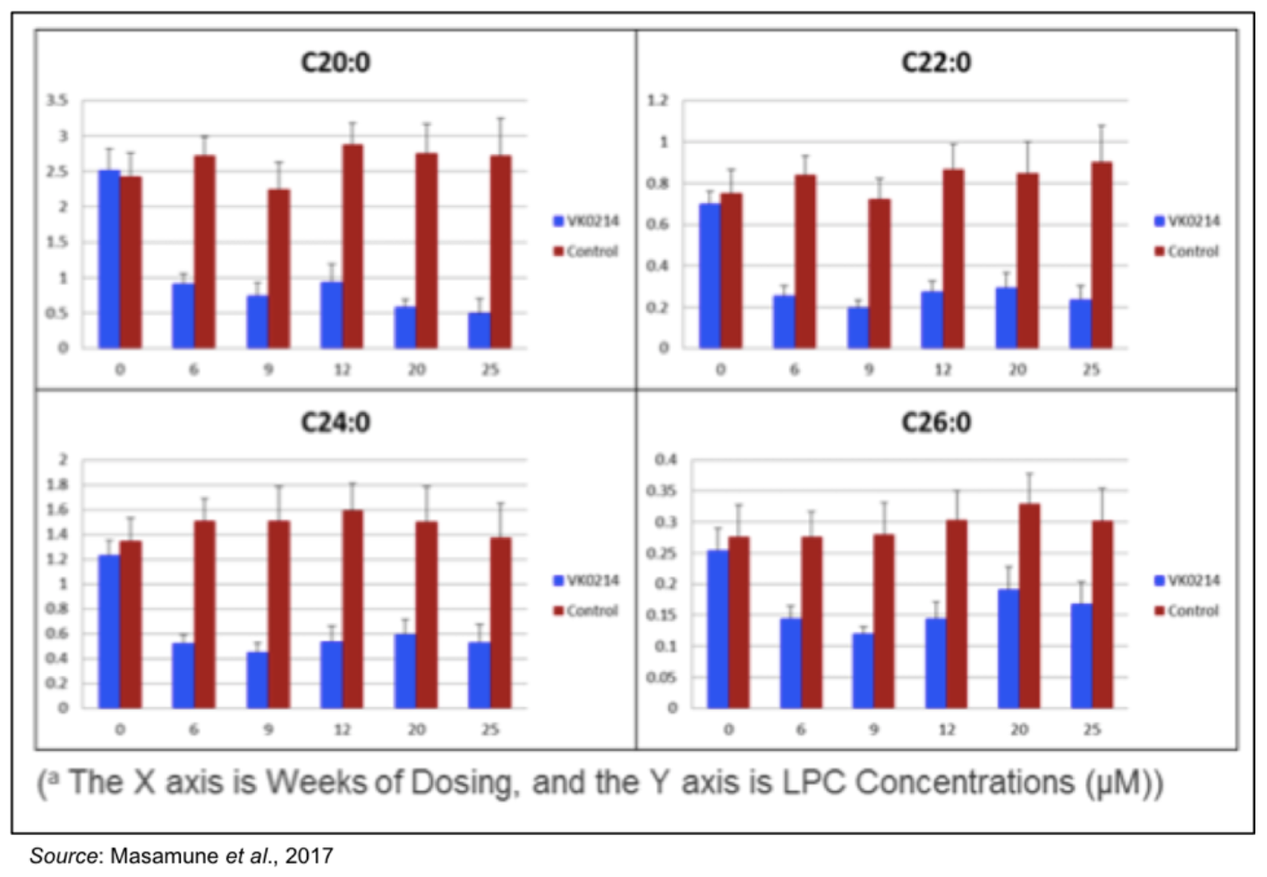 VK0214IND-enabling studies have been initiated for VK0214, another TRβ agonist that is activated by carboxyesterases that are ubiquitously expressed in the body. In October 2017, Viking announced results from a 25-week proof-of-concept study of VK0214 in an in vivo model of X-linked adrenoleukodystrophy (X-ALD) showing that treatment with VK0214 led to statistically significant reductions in plasma levels of very long chain fatty acids (VLCFAs) compared to vehicle controls. There was also a reduction seen in brain and spinal cord VLCFAs, an exciting observation as those tissues are especially prone to degeneration in X-ALD. The following charts show the level of VLCFAs over the course of the 25-week study. Treatment with VK0214 resulted in a dramatic decrease in VLCFA levels only six weeks after initiating treatment, and this decline was held relatively steady through the entire 25-week treatment period.