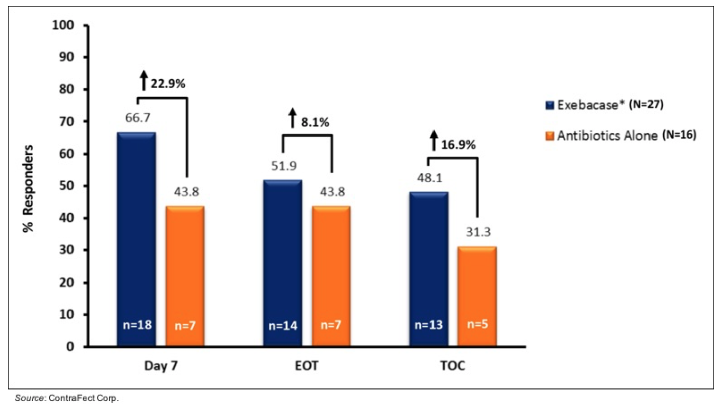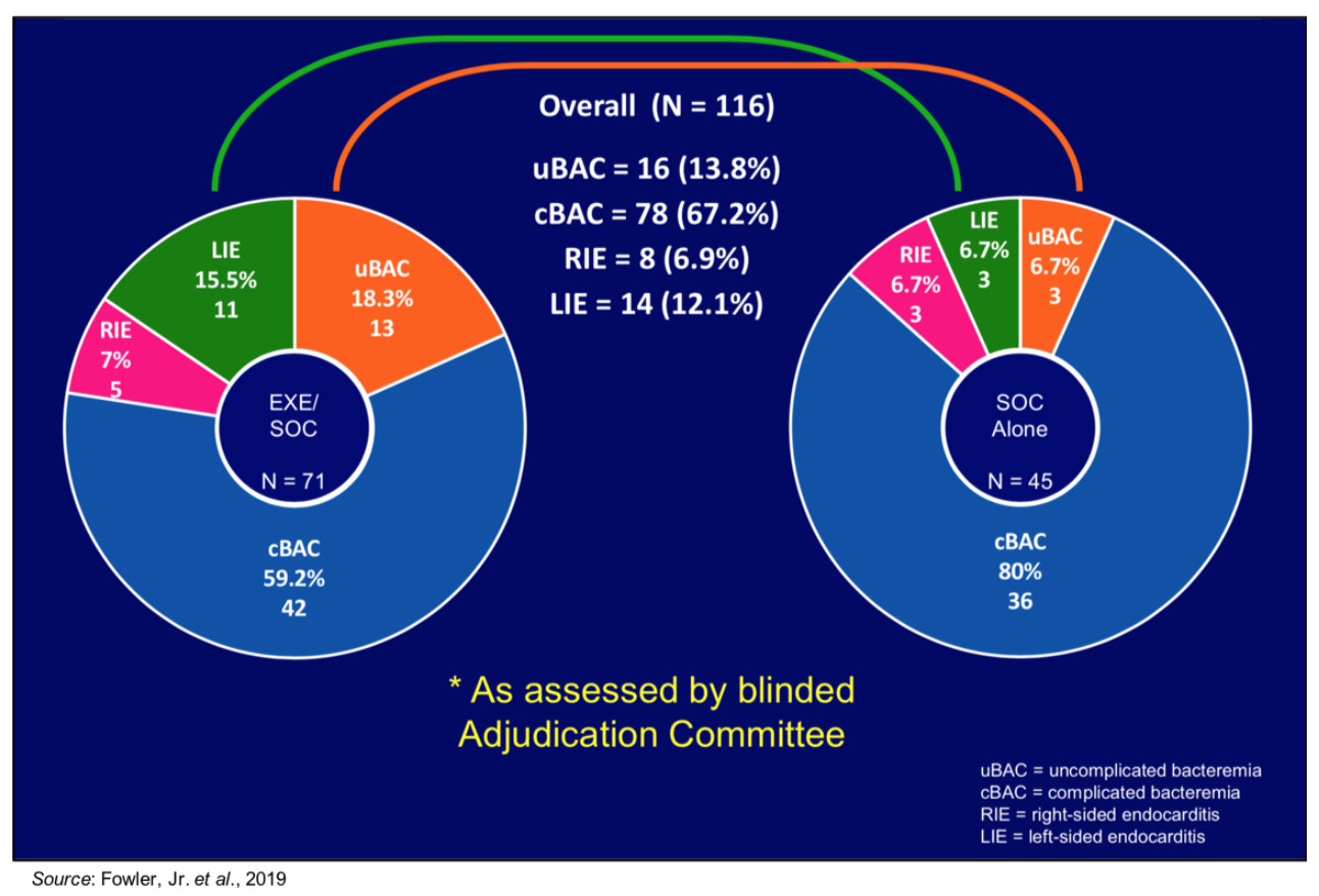 Staphylococcus aureus bacteremia including endocarditis at the 29th European Congress of Clinical Microbiology and Infectious Diseases (ECCMID). The data was presented by Vance G. Fowler, Jr., M.D., Professor of Medicine in the Division of Infectious Diseases at Duke University. The Phase 2 trial was an international, multicenter, randomized, double blind, placebo controlled trial with a superiority comparison between exebacase or placebo combined with the standard of care antibiotics. A total of 121 patients were randomized 3:2 to receive a single dose of 0.25 mg/kg exebacase or placebo administered via a two-hour infusion along with the standard of care (SOC) antibiotics. The primary endpoint of the study was early clinical response. A patient was considered a responder if they were alive, had an improvement or resolution of the signs and symptoms attributable to the