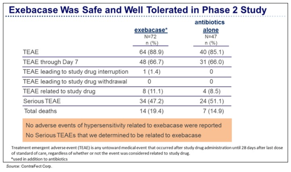 View Exhibit III As previously reported, exebacase was safe and very well tolerated. The following chart shows that the percentage of treatment-emergent adverse events (TEAE) was similar in both treatment groups and there were no reports of adverse events due to hypersensitivity to exebacase along with no serious TEAEs that were determined to be related to exebacase.