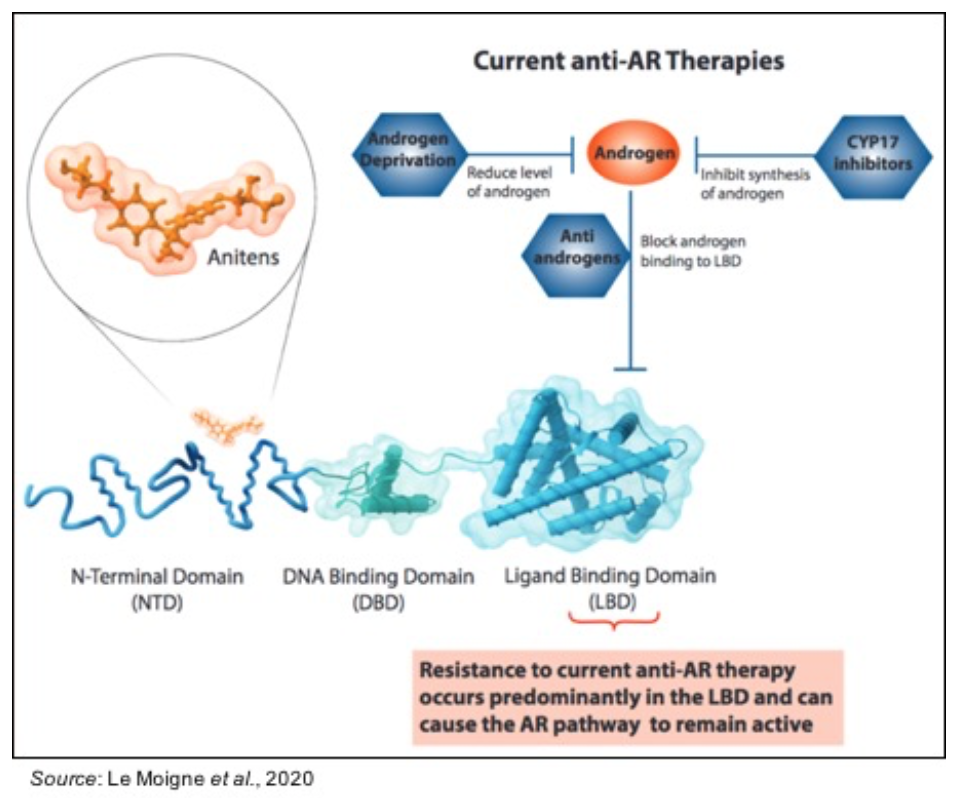 EPI-7386 is a next-generation ‘aniten’ compound that disrupts the androgen receptor (AR) signaling pathway through a unique mechanism of action that targets the N-terminal domain (NTD) of the AR, which is in contrast to the ligand-binding domain (LBD) of the AR that is targeted by all other AR-directed prostate cancer treatments. The following graphic, from a poster presented at the 2020 ASCO GU conference, shows where anitens bind on the AR compared to currently available anti-AR therapies, which fully differentiates anitens from other prostate cancer therapies that target the AR.
