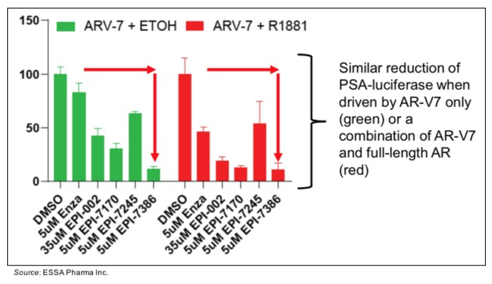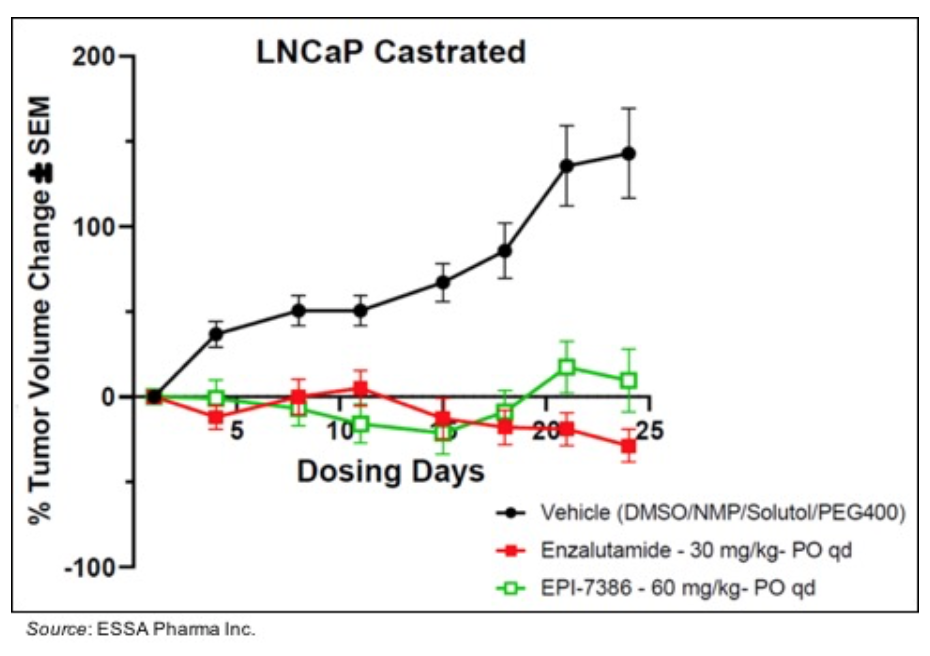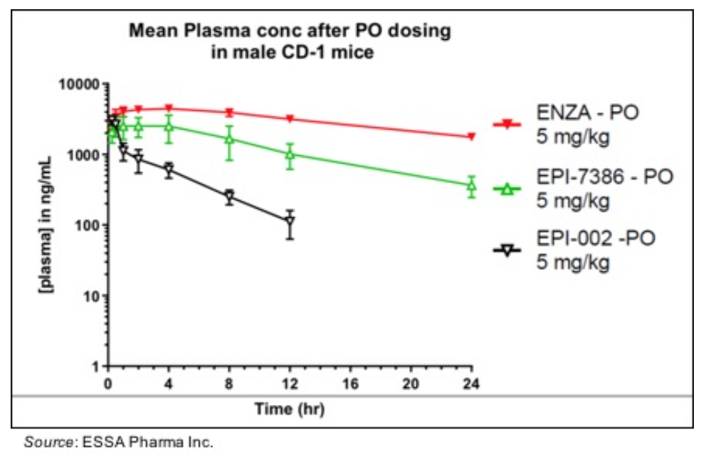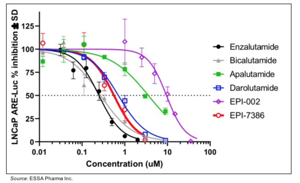 ESSA had previously tested a first-generation aniten compound, EPI-002, in a Phase 1 clinical trial in patients with mCRPC that were progressing after abiraterone or enzalutamide with serially rising PSAs (NCT02606123). While EPI-002 was shown to be safe and well tolerated, the compound exhibited a short half-life and minimal therapeutic exposure that led to suboptimal results. Therefore, ESSA embarked on a new discovery effort that ultimately led to EPI-7386, which has a number of positive attributes compared to EPI-002, including: