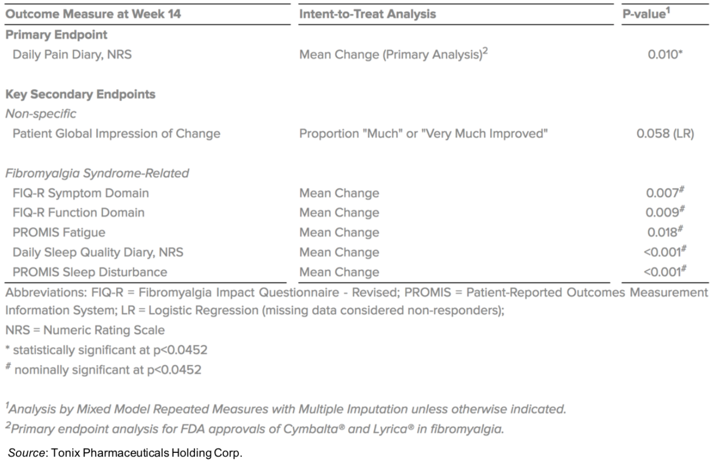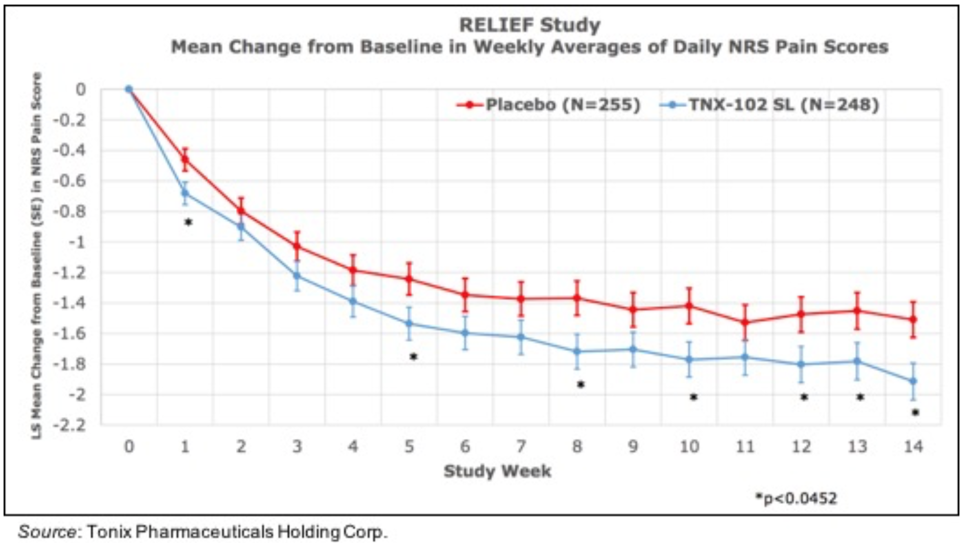 The following graph shows the results for the primary efficacy endpoint of the trial, the mean change from baseline in weekly averages of the daily diary pain numerical rating scale (NRS) scores. At week 14, participants on TNX-102 SL had a LS mean change from baseline of -1.9 units compared to -1.5 units for participants on placebo (P=0.01). The graph shows that a statistically significant separation between TNX-102 SL-treated and placebo-treated participants appears intermittently at Week 5, Week 8, and Week 10 and continues consistently from Week 12 to Week 14.