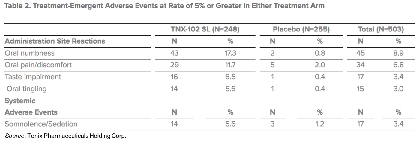 In regards to safety, TNX-102 SL was well tolerated similarly to what had been shown previously in the Phase 2 BESTFIT and Phase 3 AFFIRM trials, which both tested TNX-102 SL at 2.8 mg daily. Similar numbers of participants in the TNX-102 SL and placebo arms finished the 14-week dosing period (82.3% vs. 83.5%). The most common adverse events for the TNX-102 SL group were focused on administration site reactions, including tongue/mouth numbness, tongue/mouth pain/discomfort, taste impairment, and tongue/mouth tingling. The only systemic adverse event that occurred in ≥5% of patients was somnolence/sedation at 5.6% in the TNX-102 SL arm. This is consistent with known side effects of cyclobenzaprine, however the rate (5.6%) was lower than reported in previous trials of TNX-102 SL.