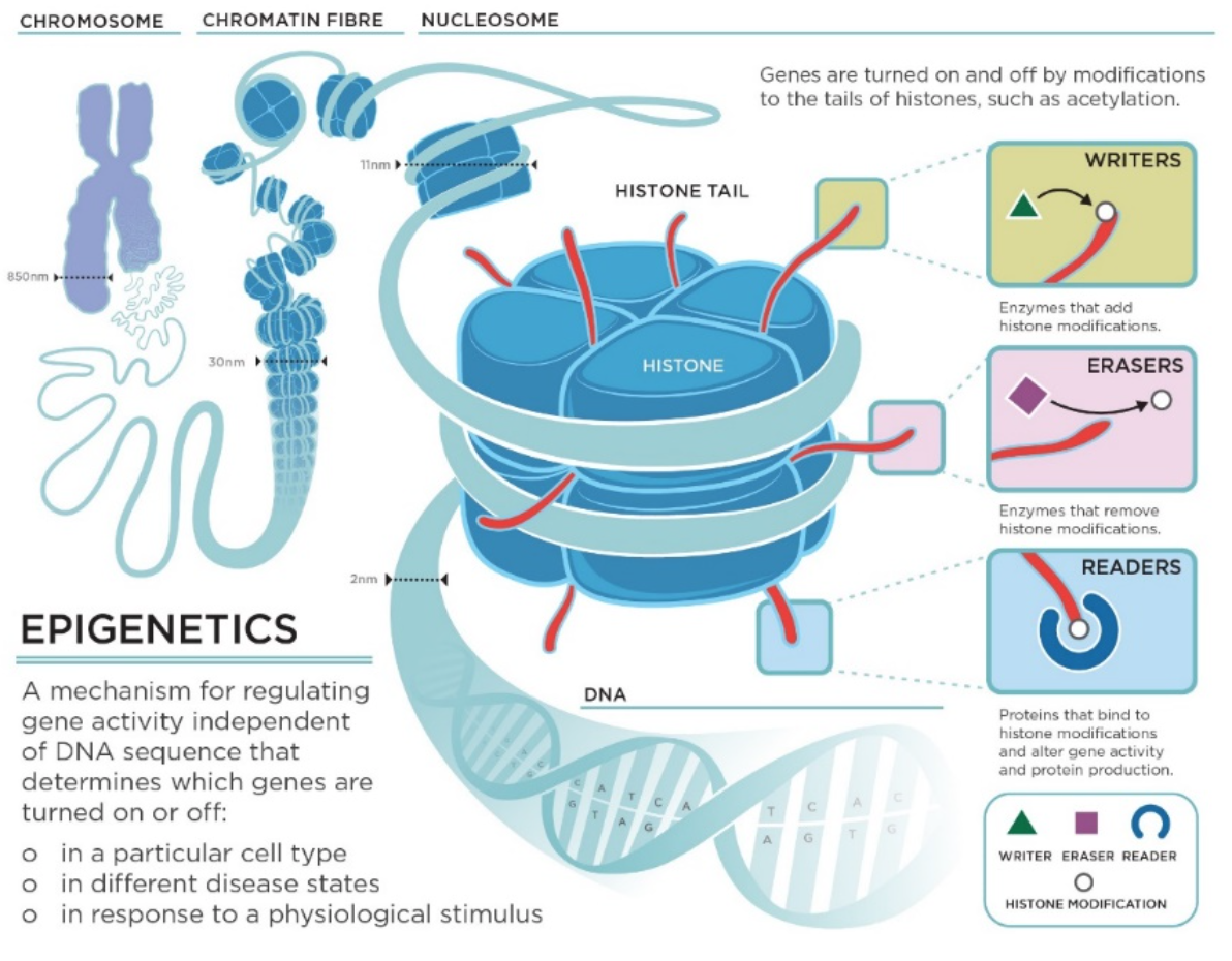 Based on our environment, biochemical processes take place in our DNA that deposit chemical tags (such as acetyl or methyl groups) on histone tails that can either stimulate or silence the expression of genes. Enzymes known as readers, writers and erasers are responsible for interacting with and modifying these chemical tags. The tags are identified and interpreted by readers, introduced by writers and removed by erasers. Acetylation, methylation and phosphorylation are the key mechanisms that attach the tags which in turn affect epigenetic expression. In one example, an acetylated lysine attaches to a histone tail which alters the chromatin structure to become more accessible and transcription increases in these regions. Bromodomains, which are amino acid chains, are specific to these acetylated sites and function as readers of lysine acetylation. Often the recognition of specific histone regions by bromodomains is necessary for protein histone association and chromatin remodeling.