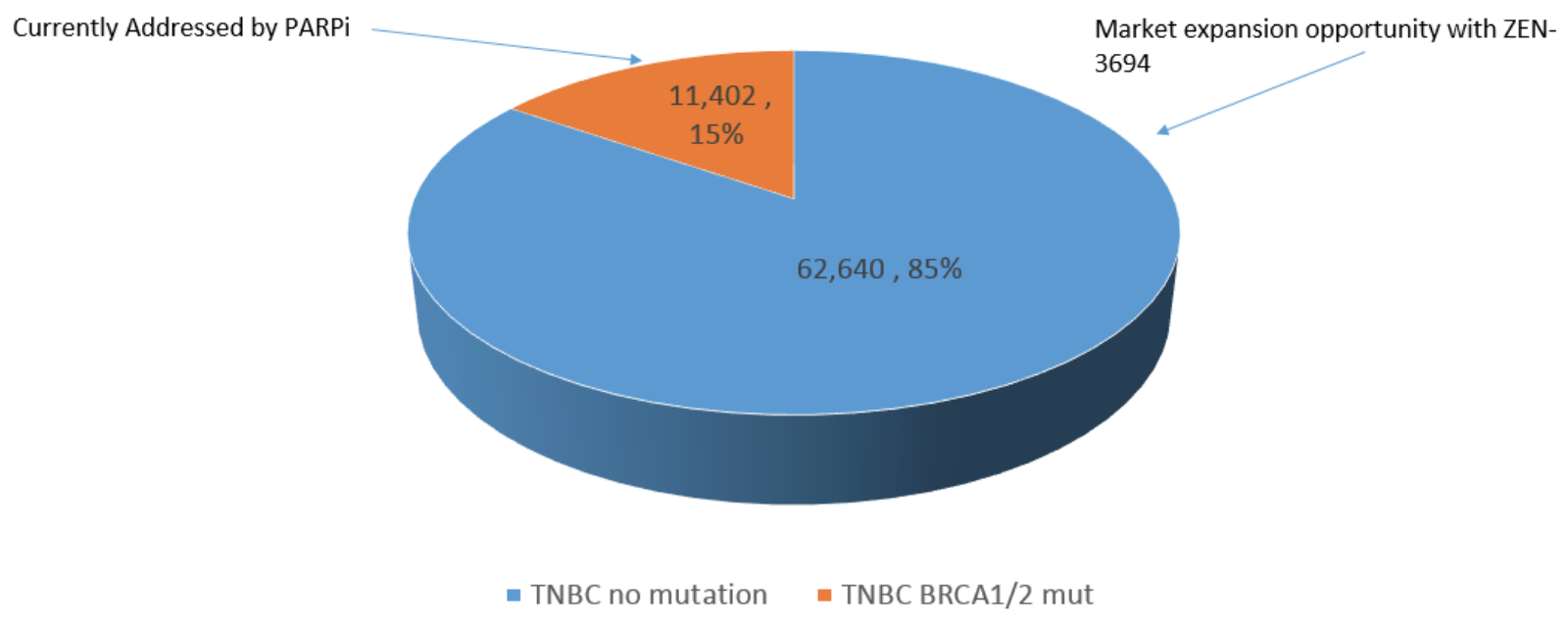 ZEN-3694 is able to modulate the epigenetic environment so that the cancer cells appear to have properties similar to a BRCA mutation. This change may allow PARP inhibitors to work in patients without the BRCA mutation, providing another line of therapy where few other options exist. This dramatically increases the size of the addressable market for PARPi from the approximate 15% to 20% of TNBC population to a much larger population. If successful, ZEN-3694 will be a very attractive partner for Pfizer and other PARPi players.