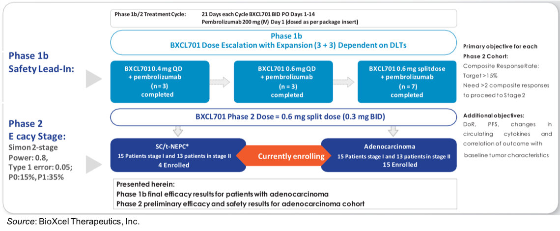 On February 11, 2021, BioXcel Therapeutics, Inc. (NASDAQ:BTAI) presented updated data for the ongoing Phase 1b/2 clinical trial of BXCL701, the company’s oral innate immune system modulator, at the 2021 ASCO GU Cancers Symposium. The multicenter, open label trial is designed to determine the safety and efficacy of BXCL701 used in combination with pembrolizumab in patients with metastatic castration resistant prostate cancer (mCRPC) with either therapy-induced neuroendocrine (t-NEPC) or adenocarcinoma phenotype (NCT03910660). A schematic of the trial is shown below, with final efficacy results presented for patients with adenocarcinoma in the Phase 1b portion of the study and preliminary results presented for patients with adenocarcinoma in the Phase 2 portion of the study.