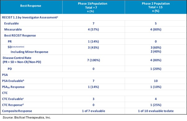 The following table shows the best response for patients in both the Phase 1b (n=7) and Phase 2 (n=15) portion of the study. For patients in the Phase 1b portion of the study, there was a disease control rate (DCR) of 100%, with one patient experiencing a partial response (PR) and another three patients experiencing stable disease (SD). In addition, one patient experienced a PSA50 response (50% reduction from peak PSA value). For the Phase 2 portion of the study, five of the patients were evaluable by RECIST 1.1 and there was a DCR of 80%. One patient experienced a PSA50 response and out of four evaluable patients for circulating tumor cells (CTC), 1 patient had a response (defined as conversion from ≥5/7.5 mL to <5/7.5 mL).