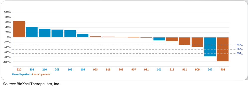 The following graph shows the best PSA response for patients in both the Phase 1b and Phase 2 portion of the trial. A total of 6/17 (35%) had any PSA response while 2/17 (12%) had a PSA70 response.