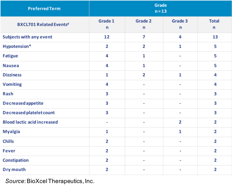 Regarding safety, the following table shows the reported adverse events that were judged by the investigator to be related to BXCL701. The majority of events were low grade and a number of them were consistent with cytokine activation. Grade 3 hypotension was seen in a patient during the first week of treatment, thus step up dosing was implemented for all new patients for the first week of treatment with 0.2 mg BXCL701 administered twice a day. Escalation to 0.3 mg twice a day was permitted if no treatment related adverse events Grade >1 or skipped doses due to hypotension or orthostasis occurred during the first week of treatment.