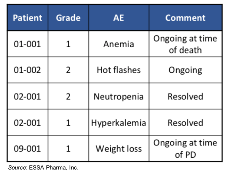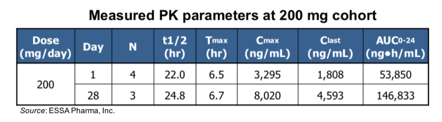 In February 2021, ESSA provided initial results for the 200 mg dose cohort. The results show that the PK parameters are right in line with what was predicted through preclinical studies. The following table shows various PK parameters measured on Day 1 and Day 28. The AUC data showing a large increase from Day 1 to Day 28 is indicative of drug accumulation with once daily dosing (steady state was reached after Day 8), and the half-life of approximately 24 hours is supportive of once daily dosing. The average AUC of approximately 147,000 is similar to what was predicted based on preclinical projections (approximately 137,000).