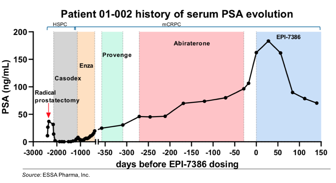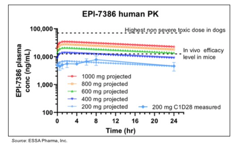 In summary, the initial clinical data for EPI-7386 presented by ESSA is very encouraging as the PK parameters for the 200 mg dosing cohort aligned very well with those predicted by preclinical studies, the half-life of approximately 24 hours is compatible with once daily dosing, EPI-7386 was safe and well tolerated, and a serum PSA decrease of >50% was observed in a patient that had failed prior anti-androgen therapy. We anticipate an additional clinical update for this trial in the fourth quarter of 2021.