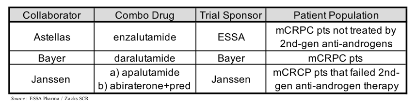 2) ESSA will sponsor the combination trial with enzalutamide while Bayer and Janssen will sponsor their respective trials. Sponsoring the enzalutamide trial will give ESSA more say in trial timelines, when data is announced, and choosing the exact patient population;