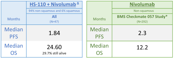 Interim data was positive and compared favorably to historical data. The CheckMate 057 study was conducted in 2015 by Bristol Myers Squibb to evaluate Opdivo in non-squamous NSCLC. CheckMate 057 was a Phase III trial evaluating nivolumab versus docetaxel in patients with previously-treated non-squamous NSCLC. Patients were randomized 1:1 to nivolumab and docetaxel, with primary endpoint of overall survival (OS). Secondary endpoints included progression-free survival (PFS) and safety. Results showed that median OS was 12.2 months in the nivolumab only group versus docetaxel at 9.4 months (2). Median PFS was 2.3 months and 4.2 months for nivo-lumab and docetaxel, respectively. This compares to cohort A of Heat’s HS-110 trial in an almost completely non-squamous population (94%) that had median OS of 24.6 months and median PFS of 1.84 months. The interim data supports the trial’s objective of clinical proof-of-concept and interim data compared favorably to historic data.