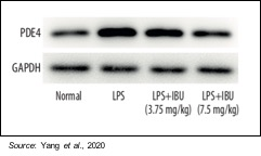 Mice were divided into four groups of 10 each: a control group, a LPS-induced group, and two MN-166 treatment groups (3.75 and 7.5 mg/kg). The following figure shows that PDE4, which MN-166 is an inhibitor of, is increased by LPS stimulation and that treatment with MN-166 decreased this overexpression of PDE4 in lung tissue in ARDS mice.