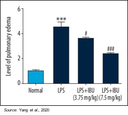 Pulmonary edema was evaluated using the pulmonary edema score to indicate the amount of water accumulation in the lungs after pulmonary damage. Pulmonary edema was significantly reduced by MN-166 treatment (P<0.001). These results suggest that MN-166 may be able to reverse pulmonary edema, which is very important to the recovery of a patient suffering from ARDS, regardless of what induced the condition.