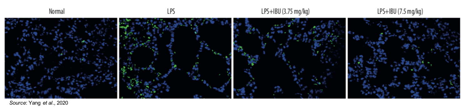 The effect of MN-166 on lung cell apoptosis was also investigated. The following figure shows a TUNEL staining assay (which measures apoptosis; indicated by bright green) in which apoptosis (cell death) is prevalent in the untreated LPS sample. However, the amount of apoptosis is decreased by MN-166 treatment, thus showing the drug’s ability to protect against pulmonary injury.