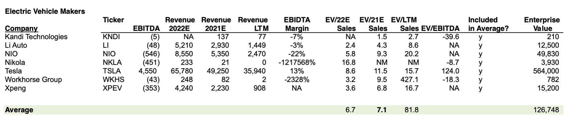 • Using established public auto companies comparables, it was determined the average EV/sales multiple was 3.5 times and the average EV/EBITDA was 15 times. Applying that to Mullen’s expectations yielded a discounted $45-$117 and $37-$98 per share using the two methods respectively.