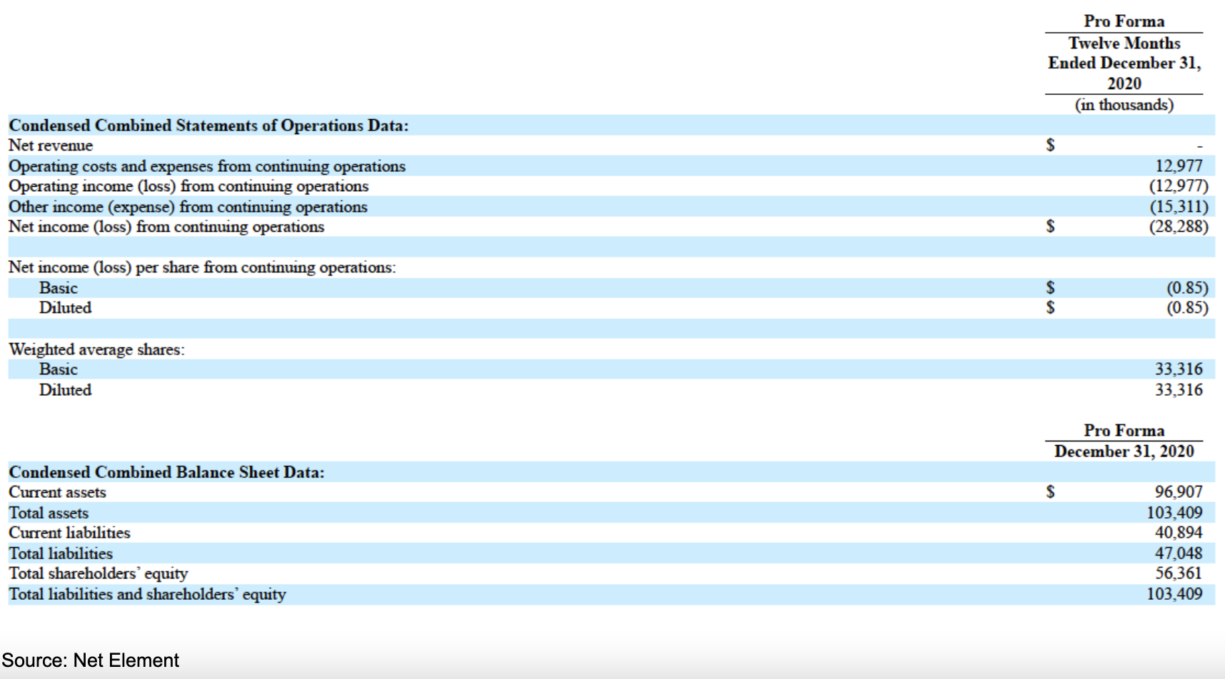 • It was calculated that Net Element’s enterprise value per share was $46 using publicly available revenue and EBITDA estimates compared with an average of recent SPAC transactions,