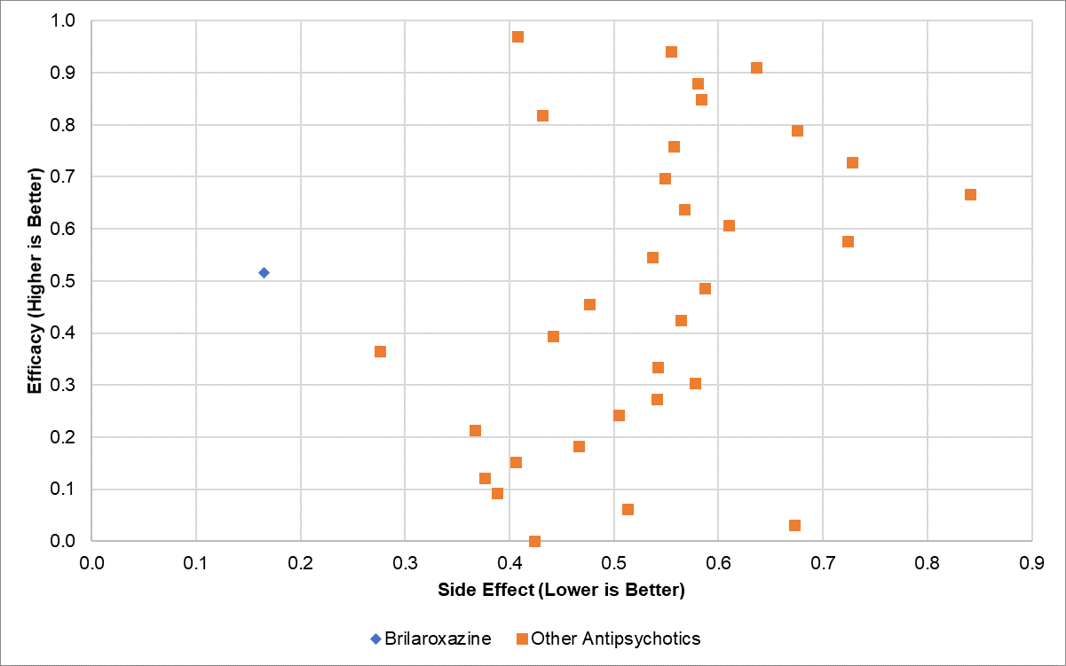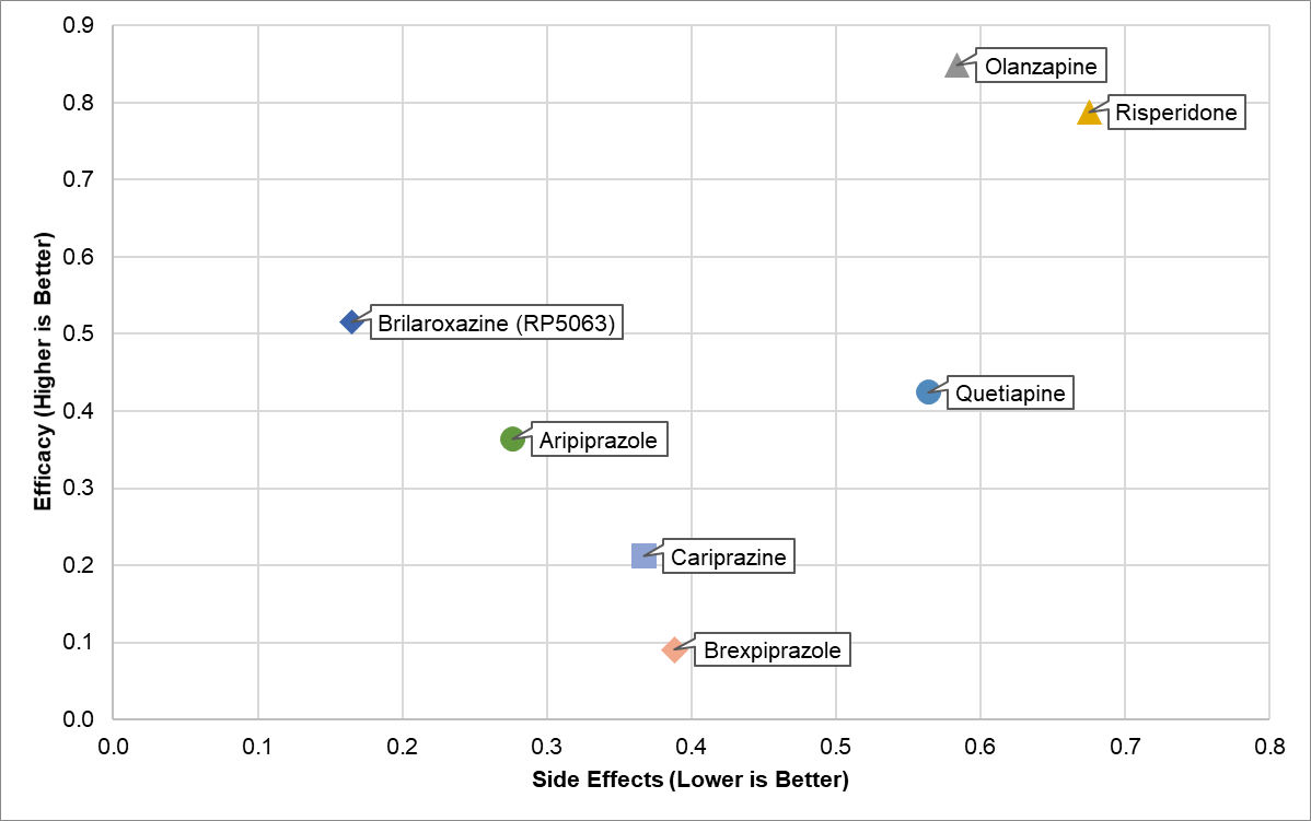 Based on the analysis, it appears that 15 mg brilaroxazine is differentiated among the major antipsychotics. Brilaroxazine efficacy is only above average compared with other treatments; however, the drug offers a class-leading lack of side-effects. Side effects are a material deterrent to treatment adherence and patients are forced to weigh the benefits against the side effects. Also noteworthy is that RP5063 is superior to aripiprazole in both efficacy and side effects. RP5063 is a chemical evolution of aripiprazole, sharing the same underlying structure but making one key change, namely replacement of a carbon atom with an oxygen atom in the quinoline ring, resulting in a benzoxazinone ring. RP5063 is also structurally similar to cariprazine and brexpiprazole. The attributes of above average efficacy combined with class-leading lack of side effects holds up when the analysis is extended to all 32 available antipsychotics included in the meta-analysis.