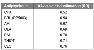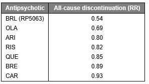 If approved, patients may finally have a therapeutic option that involves less of a trade-off between efficacy and side effects. Again, adherence to treatment may be improved if the side effects are minimized. Below is an analysis of compiled discontinuation ranking. A lower risk ratio (RR) is better.