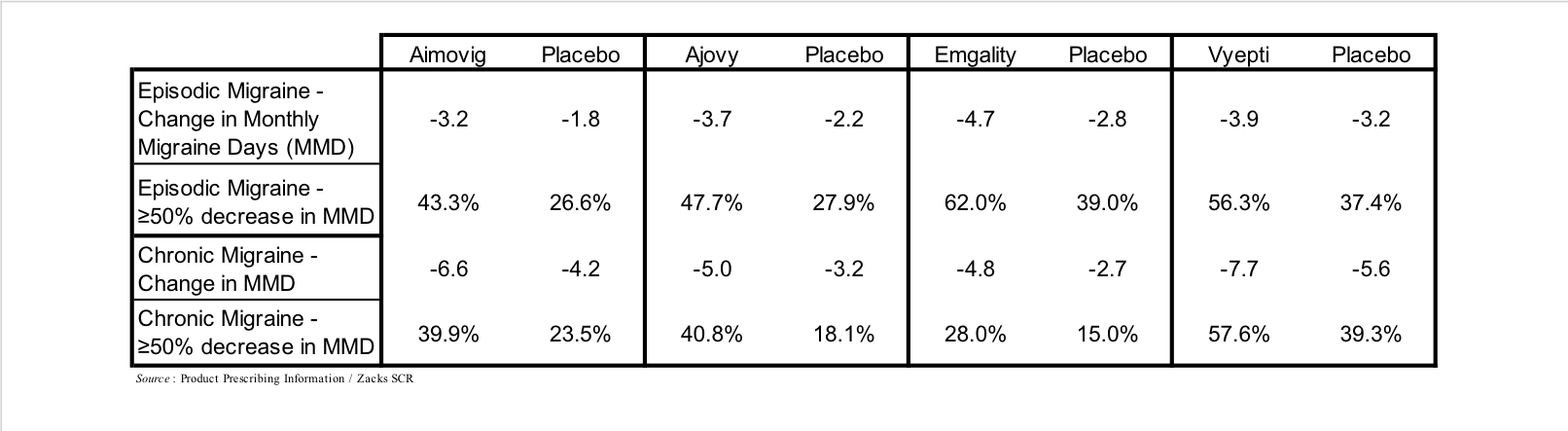 Antibodies that target the interaction of CGRP with its receptor represent the newest class of prophylactic treatments and include Aimovig (erenumab), which targets the CGRP receptor, and Ajovy (fremanezumab), Emgality (galcanezumab), and Vyepti (eptinezumab), which each target CGRP. These drugs generated approximately $1 billion in sales in 2020, and are estimated to generate 2026 sales of $4 billion (EvaluatePharma). A summary of their results in Phase 3 clinical trials is shown in the following table.