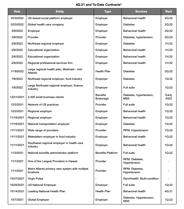 Dario continued its momentum into 2022 in its B2B2C initiative, executing multiple contracts. In the fourth quarter alone, Dario won 14 contracts bringing the annual total to 54 in 2021. Eleven additional contracts have been added to date in 2022. Below we summarize the latest closed agreements, including two that were announced post the earnings release.