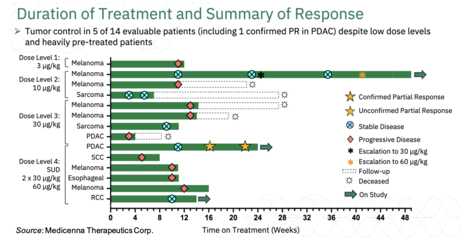 1. Fourth-line (4L) PDAC Stage IV (Dose Level 4 @ 60 μg/kg following two divided doses of 30 μg/kg); confirmed PR