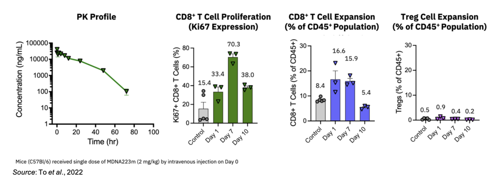 The following image shows that MDNA223m (the mouse surrogate of MDNA223) induces a prolonged pharmacodynamic (PD) response that extends beyond the duration of the serum exposure. Following a single dose of MDNA223m (2 mg/kg), the pharmacokinetic (PK) profile shows a decline in the serum concentration of MDNA223m but with an increase in CD8+ T cell expansion through Day 7. This increase in CD8+ T cells is also not accompanied by any increase in Treg cells.