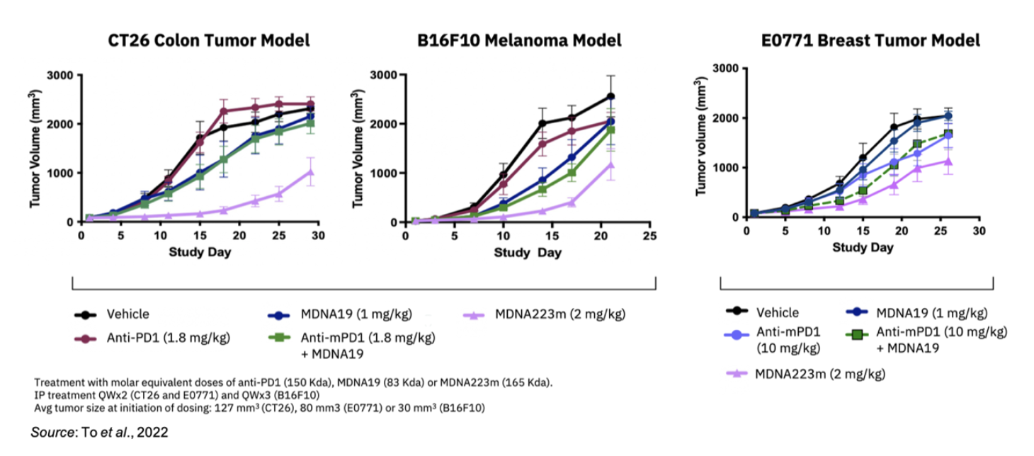 In addition to the extended PD effect, MDNA223m exhibited superior efficacy in three separate mouse tumor models (colon, skin, breast) compared to co-administration of an anti-PD1 antibody and MDNA109FEAA. This shows that the synergy resulting from MDNA223 concurrently targeting PD1 and IL-2 receptor on the same cell leads to an enhanced response compared to co-administration of anti-PD1 and IL-2 therapies.