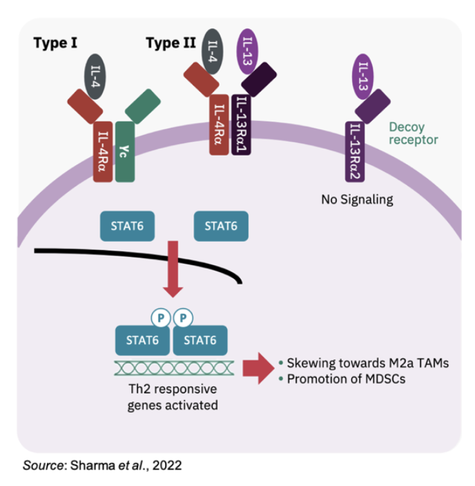 Fc-MDNA413 is an IL-13 super-antagonist that binds to the Type II IL-4 receptor (made up of IL-4α/IL-13Rα1) that is expressed on tumor associated macrophages (TAMs) and myeloid derived suppressor cells (MDSCs). An overview of IL-4/IL-13 signaling is shown below. Binding of native IL-13 to the Type II receptor activates the Stat6 signaling pathway that ultimately promotes TAMs and MDSCs. Both of these cell types limit immune effector cells and promote an ‘immunologically cold’ tumor microenvironment (Bhattacharjee et al., 2013).